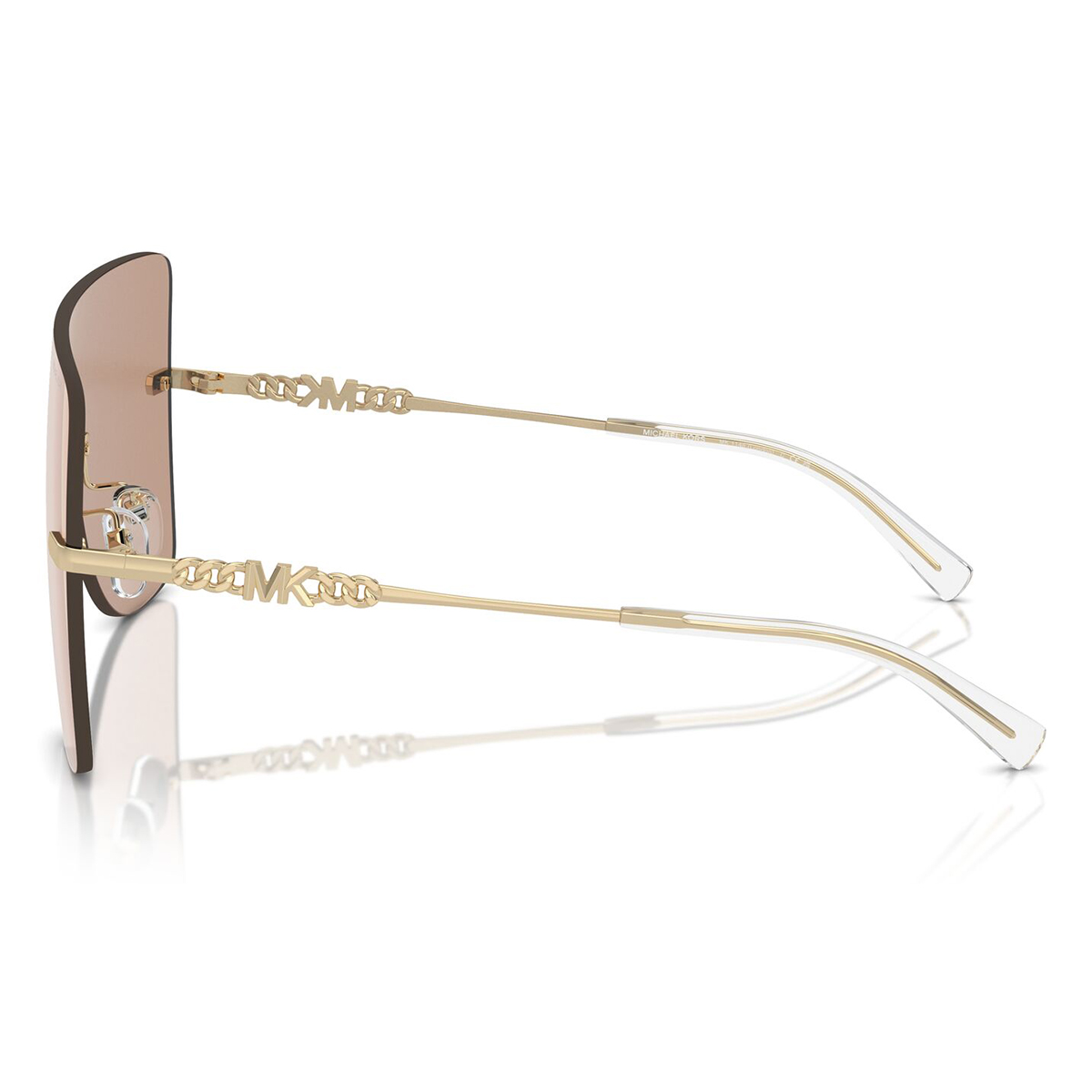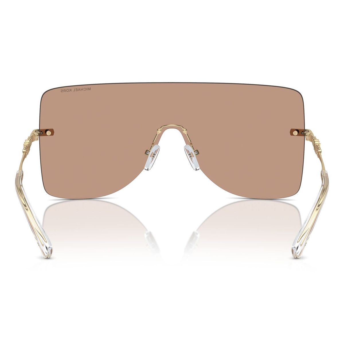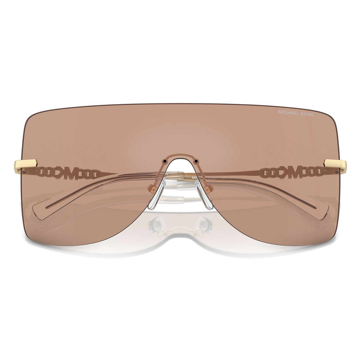 These shield sunglasses are presented in a gold frame and are made from premium metal. They are completed by brown solid back mirror lenses. This sunglass is especially designed with women in mind.