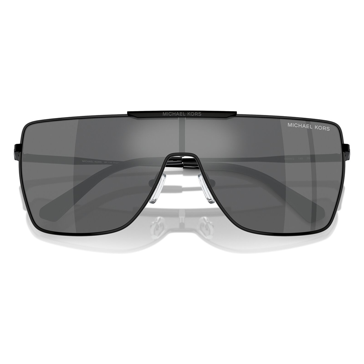These shield sunglasses are presented in a polished black frame and are made from premium metal. They are completed by dark grey with lightly mirrored lenses. This sunglass is a unisex frame perfect for both men and women.